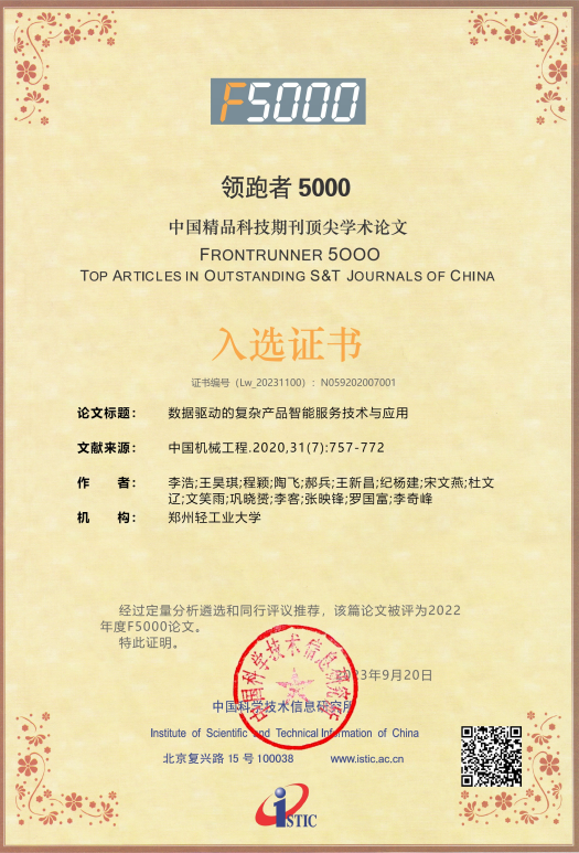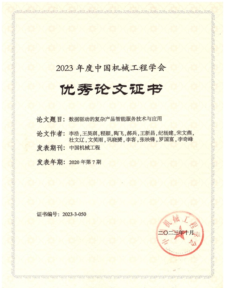 近期,中国机械工程学会公布2023年优秀论文遴选结果,GG游戏试玩平台 李浩教授等发表的《数据驱动的复杂产品智能服务技术与应用》获2023年度中国机械工程学会优秀论文。该论文发表在机械工程领域知名期刊《中国机械工程》2020年第7期,此前该论文被评为2022年度领跑者F-5000中国精品科技期刊顶尖学术论文。