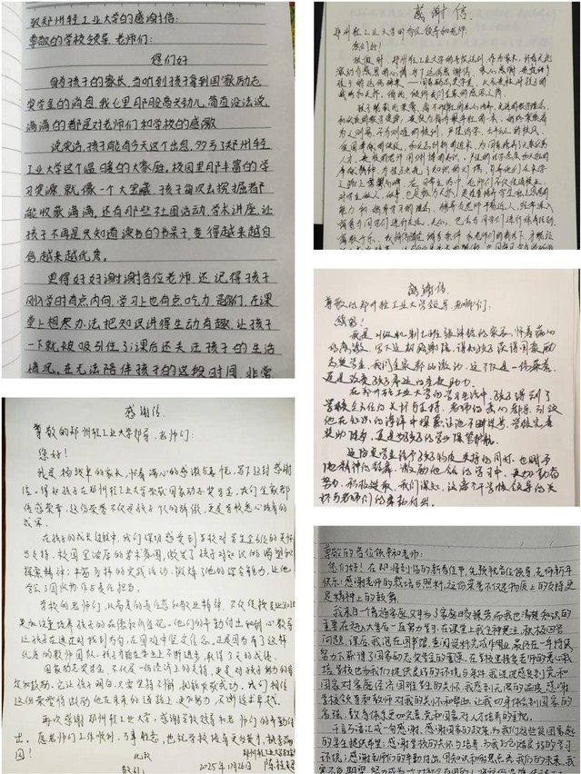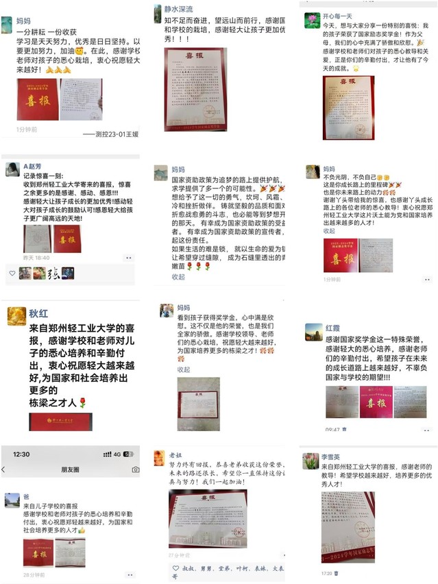 上学期期末,GG平台 组织为所有获得国家奖学金、国家励志奖学金的学生召开喜报颁发会。寒假期间,学生将喜报带回家乡,与家长朋友们共同分享这份喜悦和荣誉。喜报发放不仅成为学生成长的“云端表彰会”,更搭建起家校沟通的情感纽带,GG平台 陆续收到家长朋友们的反馈。许多家长纷纷发表朋友圈分享喜悦,配文“收到郑州轻工业大学的喜报,惊喜之余更多的是感谢、感动、感恩!”,有的家长甚至给学校手写感谢信,分享对孩子成长的感悟与对学校的感激之情。