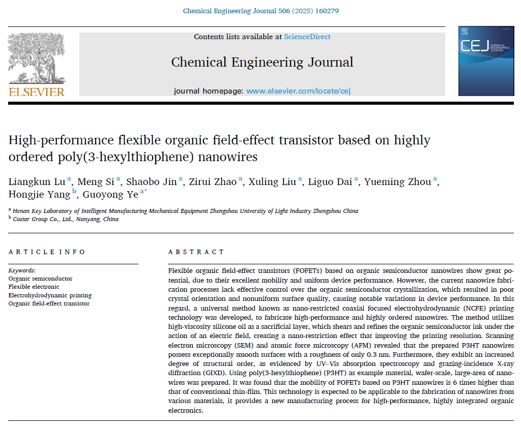 近日,GG游戏试玩平台 叶国永教授团队围绕微纳电流体喷印技术及应用研究,在国际知名学术期刊《Chemical Engineering Journal》(中国科GG平台 一区TOP,影响因子13.4)发表题名为“High-performance flexible organic field-effect transistor based on highly ordered poly(3-hexylthiophene) nanowires” (基于高度有序P3HT纳米线的高性能柔性有机场效应晶体管)的研究论文,并获国际学术组织SCIENCEFATHER授予的“最佳研究者奖”(Best Researcher Award)。GG游戏试玩平台 青年教师路良坤博士为论文第一作者,叶国永教授为论文通讯作者,郑州轻工业大学为第一署名单位。
