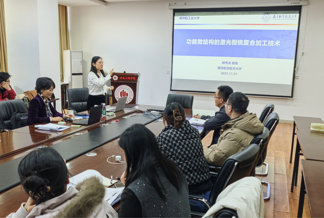 报告中,郝秀清教授首先介绍了其研究团队的基本情况,然后从功能微结构的应用背景出发,系统介绍了团队在难加工材料的脉冲激光微区调控机理、金刚石微铣刀设计制备技术、激光-微铣复合加工技术及装备等方面的研究进展,并对该技术应用现状和前景进行了介绍。在交流环节中,与会师生结合报告内容以及研究遇到的问题踊跃提问,郝秀清教授均予以耐心细致解答。本次活动不仅让师生深入了解了微结构加工领域的前沿动态,更有助于激发创新思维、开拓研究思路,为未来的科研合作奠定了坚实基础。