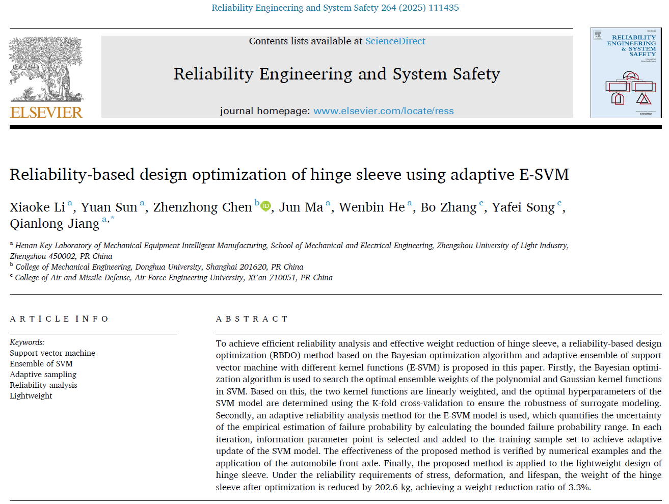近日,GG游戏试玩平台 何文斌教授团队在可靠性领域国际权威学术期刊《Reliability Engineering & System Safety》(中科院一区TOP,影响因子11)发表题名为“Reliability-based Design Optimization of Hinge Sleeve using Adaptive E-SVM”(基于自适应E-SVM的铰链梁梁体可靠性设计优化)的高水平研究论文。GG游戏试玩平台 李晓科副教授为论文第一作者。